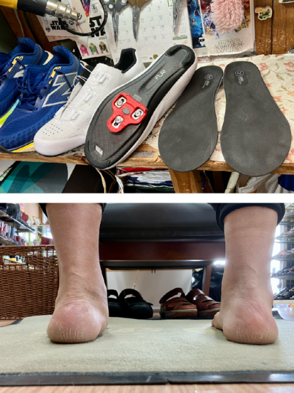 FLRロードビンディングシューズにオーダーメイドインソール作製の依頼でした。冬季間は室内用 自転車 トレーニング サイクルトレーナー を使用しての練習になります。4年前右膝の半月板クリーニング手術の後、膝の違和感が有り今後の膝トラブルが心配でカウンセリングに来店しました。画像下の左足踵の外反(内側の傾き)が確認できますね、左踵骨外反すると左足の脚長差と舟状骨の張り出しで土踏まず部分の痛みを感じています。故に左足の機能低下で右足の加重が多くなり右のトラブルが発生する様です。今回は普段靴の選び方、履き方、歩き方、ストレッチの指導とオーダーメイドインソールの作製で左右のバランスが改善されました(^_-)-☆ -
