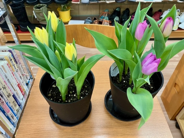 毎年富山県の親戚が 冬の寂しい景色を少しでも明るくする為、送って頂いてるチューリップが店内で咲き出しました!