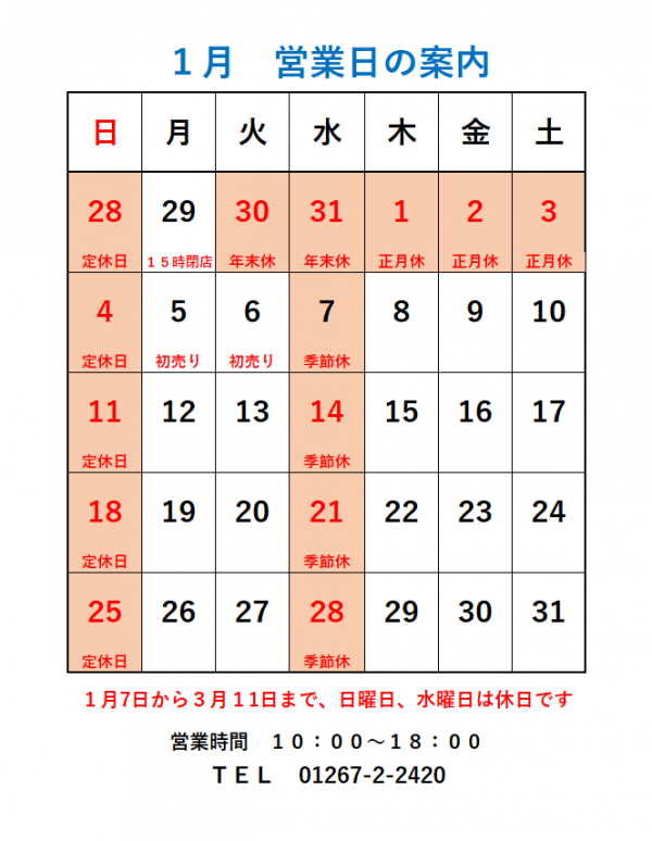 1月7日(水曜日)~3月11日(水曜日)までの間、毎週日曜日と水曜日は休業になります。
